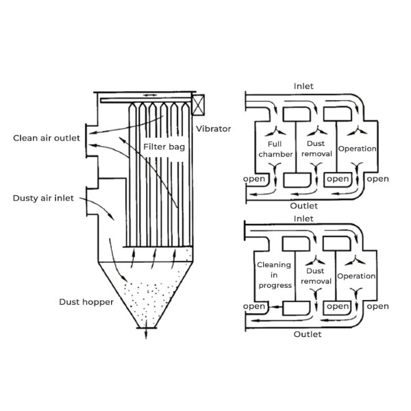 A filtro a sacco raccoglitore di polveri utilizza una serie di sacchetti filtro in tessuto per rimuovere il particolato dal flusso di gas. Questo tipo di aspiratore è ideale per le industrie in cui si generano polveri fini, secche e non fibrose. Il gas carico di polvere entra nel collettore e passa attraverso i maniche filtranti, dove le particelle più grandi si depositano sul fondo della tramoggia, mentre le particelle più fini vengono catturate dal tessuto filtrante. Il gas viene quindi purificato, garantendo che le emissioni soddisfino gli standard ambientali.
