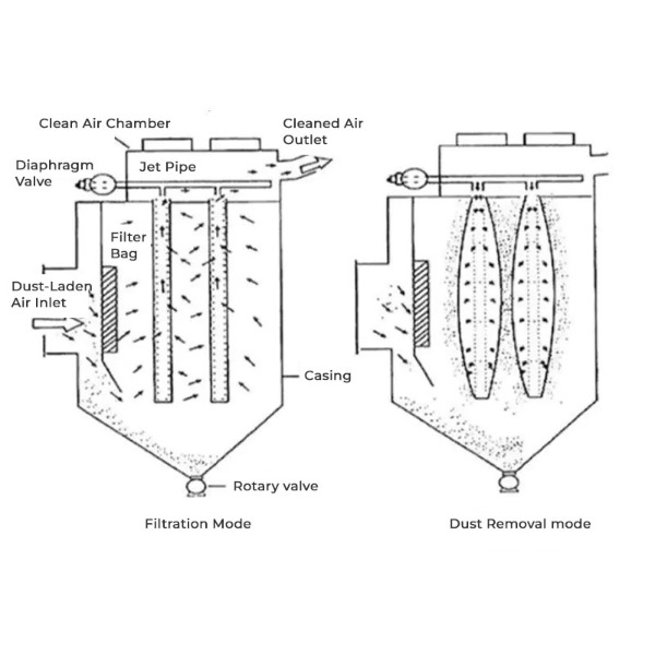 Per garantire che i sacchetti non si intasino di polvere, viene utilizzato un meccanismo di pulizia per rimuovere la polvere dai sacchetti filtro a intervalli regolari. Questa operazione viene generalmente eseguita utilizzando aria compressa, che fa esplodere la polvere dai sacchetti filtro, inviandola nella tramoggia per lo smaltimento.
